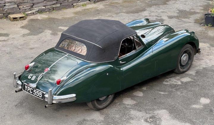 A totally correct and exceptionally original example of a rare UK market, RHD drophead, supplied new in 1955 by The Woodcote Motor Co, Epsom. Sound condition, cosmetically mature and appealing, retaining original, mellowed tan leather interior, and of nicely understated specification with disc wheels and spats. The paint shows its age in a quite charming way, the chrome work is very good to excellent, and the overall appearance is seductively appealing. One owner from 1974 to 2015, and one since. Just 6,000 odd miles covered during those fifty years! Recent work has included a new stainless exhaust, new clutch, complete re-wire and a good deal more besides. Comes with a Jaguar heritage certificate confirming original specification and colour scheme, and a file of invoices from recent years showing parts expenditure, etc. Driving very nicely, sounding great, and fun to whizz around in! Very few survive in such undisturbed condition!